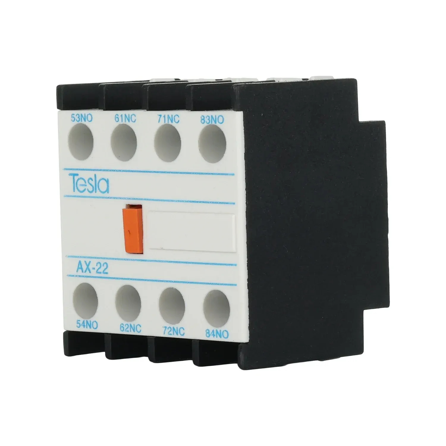 The Tesla AX22 is a clip-on auxiliary contact block with a 2NO + 2NC configuration, designed to extend the control functions of contactors and circuit breakers. It provides a balanced mix of normally open and normally closed contacts, making it ideal for complex control circuits requiring multiple feedback or interlock points.