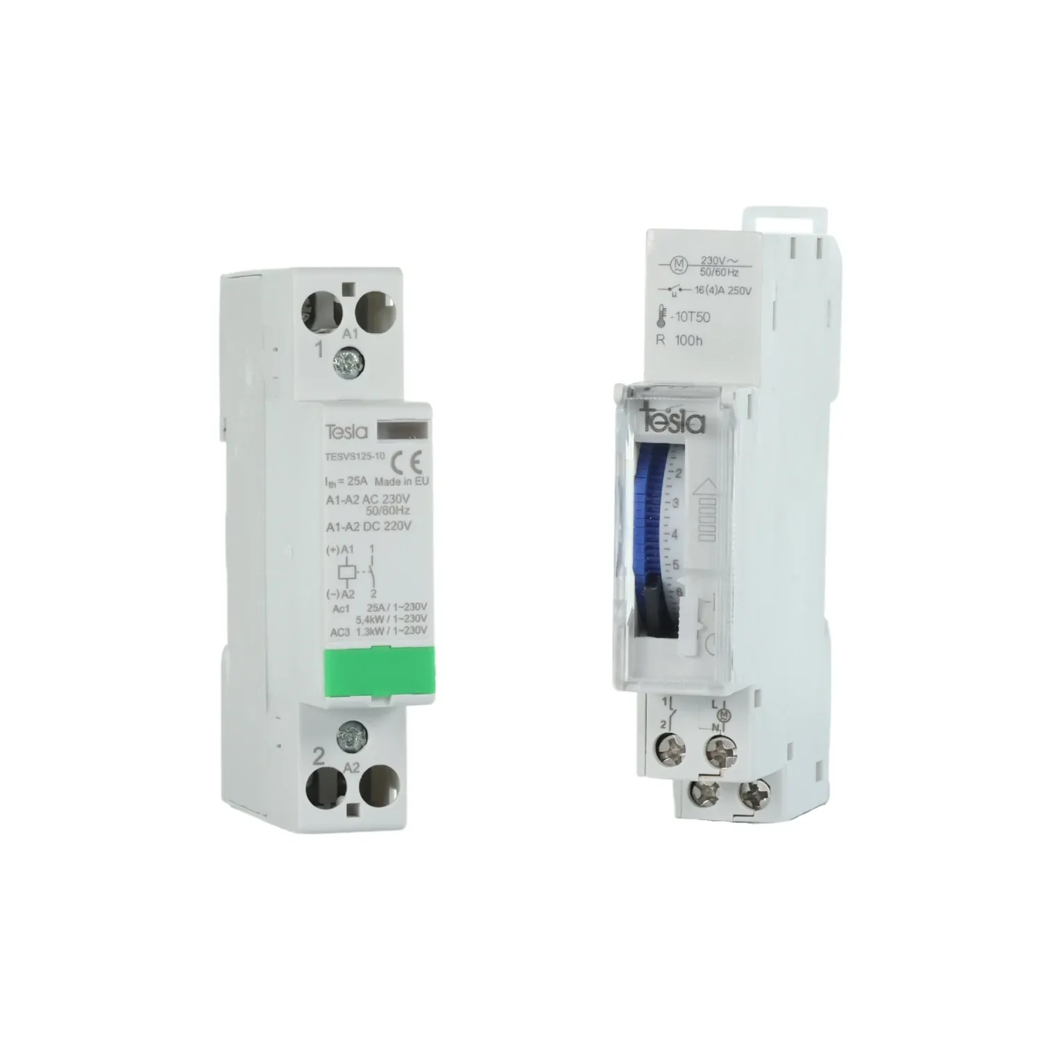 The Tesla TESHWP Hot Water Pack combines the TESATS1DR Analogue Timer with the TESVS125-10 Modular Contactor, providing a DIN-rail ready solution for controlled operation of hot water systems and other resistive single-phase loads up to 25A. Pre-matched for compatibility, this bundle is ideal for domestic, commercial, and light industrial energy management applications.