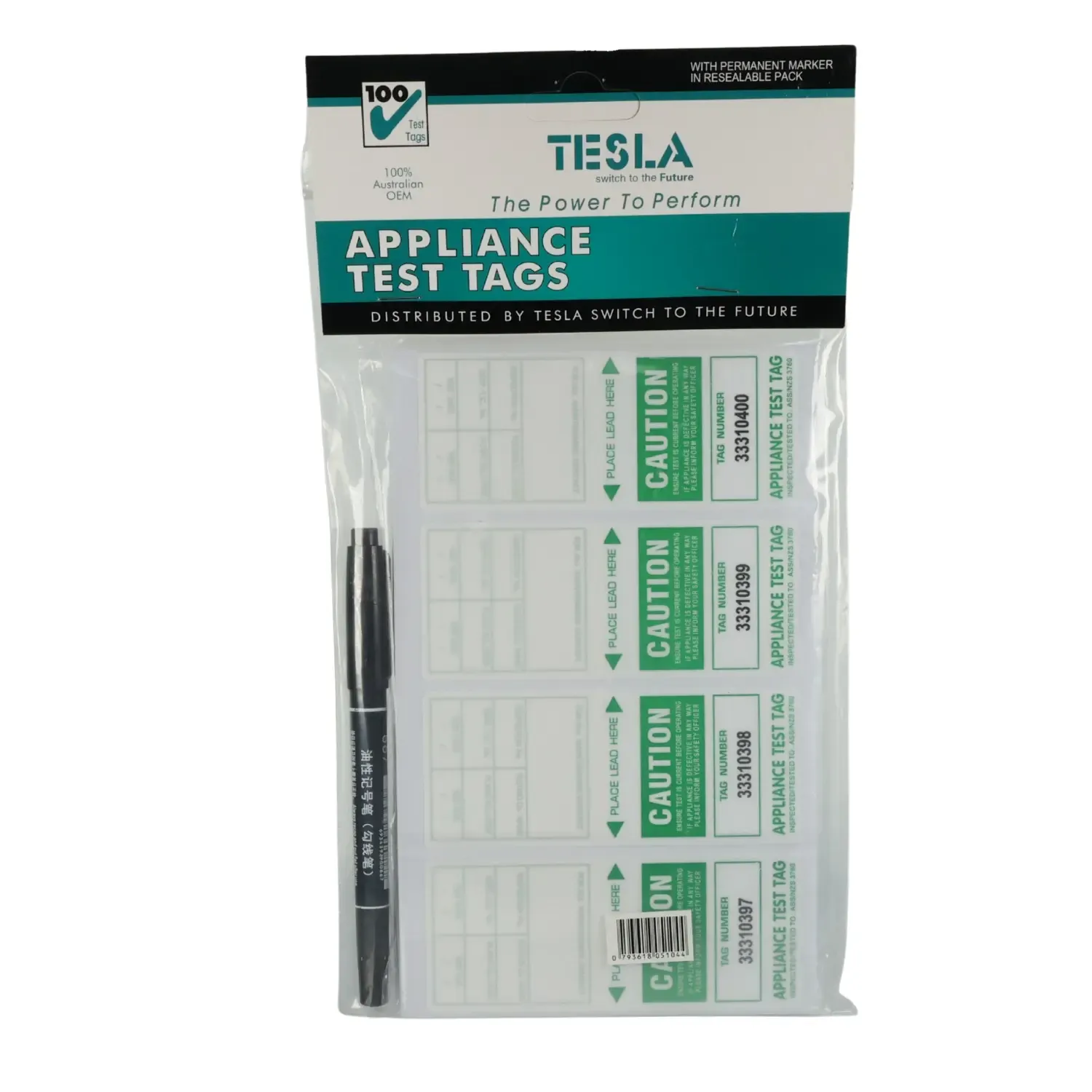 The Tesla TTAGGREEN are self-laminating appliance test tags designed for compliance with Australian test and tag standards. Supplied in a 100 pack with pen, these tags are smudge-resistant, durable, and easy to apply. The green colour is part of the national tagging rotation, helping indicate when equipment was last tested.