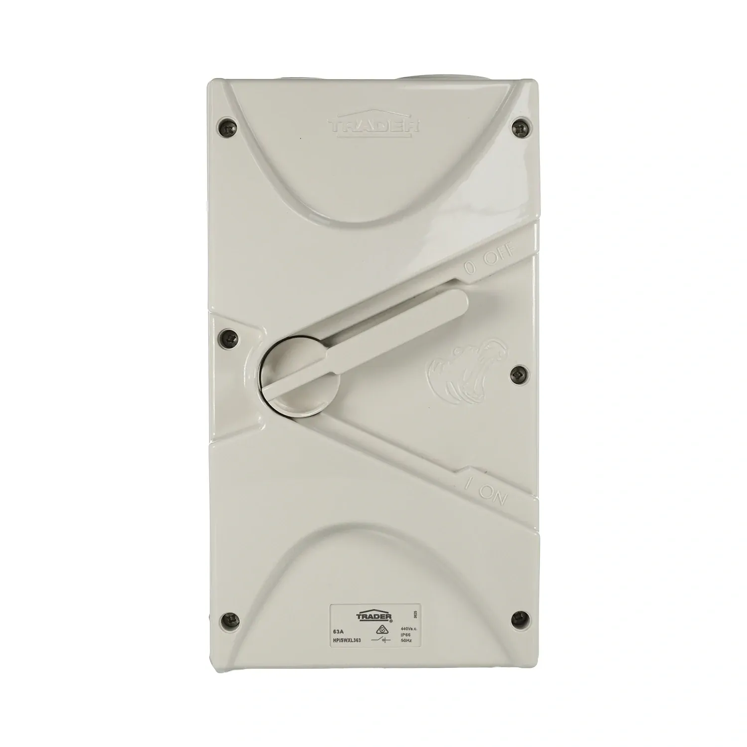 The Trader HPISWXL363 is a heavy-duty 63A 440V three-pole weatherproof isolator, designed for reliable disconnection in outdoor and industrial environments. Its extra-large IP66-rated enclosure includes twin 40mm and 32mm threaded entries on both the top and bottom, providing flexibility for larger conduit and cable access. Made from UV-stabilised polycarbonate, the housing resists fading and impact, while the base-mounted isolator module ensures wiring stability during installation. The padlockable handle adds security, and the isolator is fully compliant with AS/NZS 3133 and AS/NZS IEC 60947-3 standards.