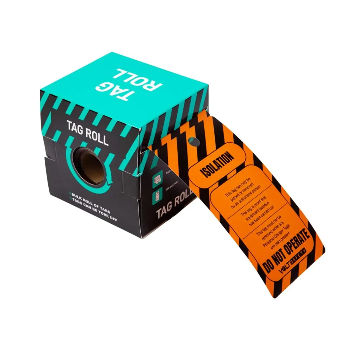 The Volt Safety LOCKOUT-TAG-TR03-P200-ISO Isolation Lockout Tag Roll provides a clear warning that equipment or circuits have been isolated. Each roll contains 200 tags used during lockout procedures to communicate that power or operation has been intentionally disconnected for safety.