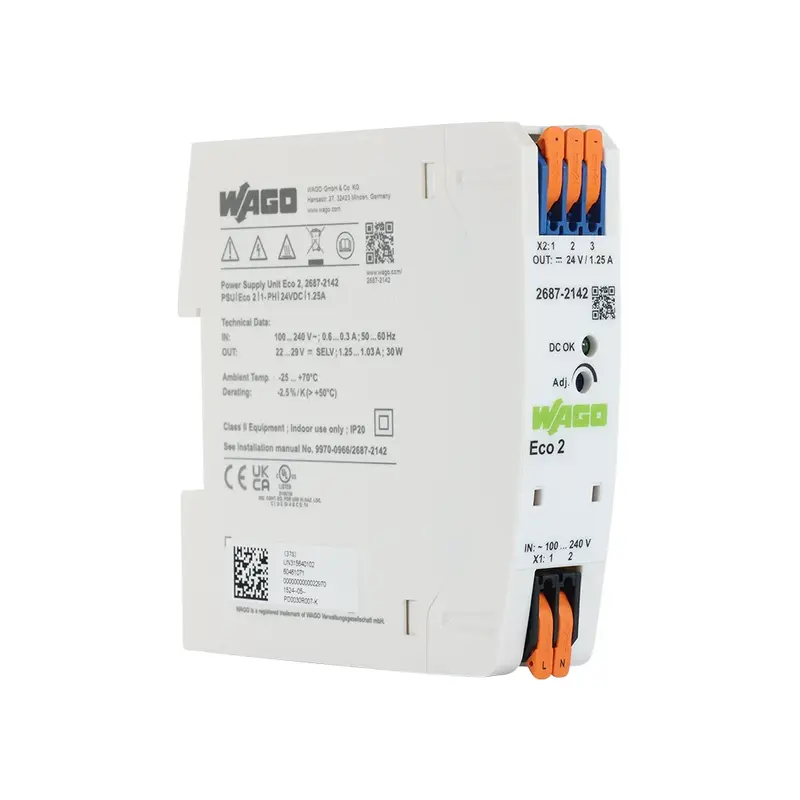 The Wago 2687-2142 Eco 2 Power Supply offers dependable 24V DC output, making it a strong choice for essential installations in industrial and electrical applications. This single-phase power supply delivers up to 1.25A and 30W, ensuring stable voltage with energy efficiency and a compact design. Its push-in CAGE CLAMP® terminals and tool-free lever make wiring fast and straightforward, while the DC OK LED provides a quick visual status check.