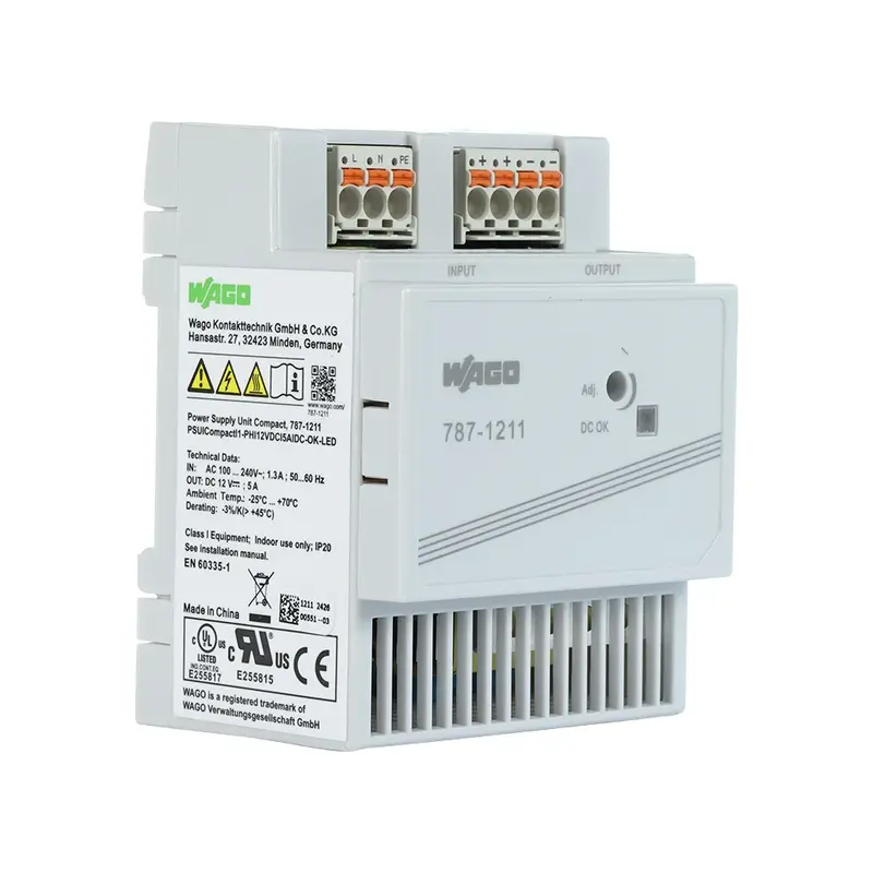 The Wago 787-1211 Switch Mode Power Supply is a compact 12V DC unit with a 5A capacity and a 60W output, making it a reliable option for control and automation tasks. This versatile power supply accepts both AC (85-264V) and DC (125-375V) input, allowing it to integrate seamlessly into standard distribution boards. Its compact, stepped design makes DIN-rail mounting easy and space-efficient in electrical panels.